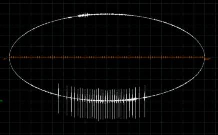 撤掉校准脉冲发生器开始加压,测试电压频率在110Hz左右,加压到1.1Um时,无明显的放电现象,局部放电测试仪显示波形同背景波形,当测试电压加压到1.5Um时,高压侧出现明显的电晕放电波形,现场也可听到明显的劈啪的放电声,观察发现在高压侧防晕罩下沿可以看到明显的放电现象。图4所示为电晕过程中仪器界面显示电晕放电波形情况。