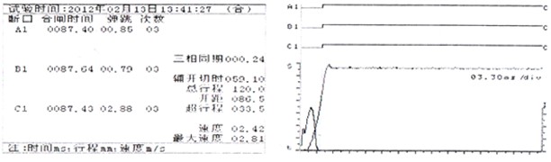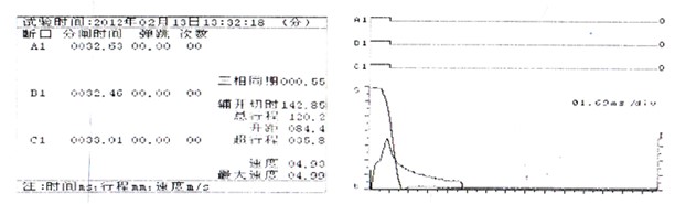 我司技术服务人员于2012年02月13日,前往浙江开关厂有限公司,使用CT2009高压开关动特性测试仪,对ZFW□-126型SF6气体绝缘金属封闭开关设备(GIS)的断路器进行了机械特性试验,现场测试数据稳定、可靠,符合出厂试验断路器机械特性参数值。同时该款CT2009高压开关动特性测试仪便捷的测控操作受到了用户的好评。具体现场试验数据如下: