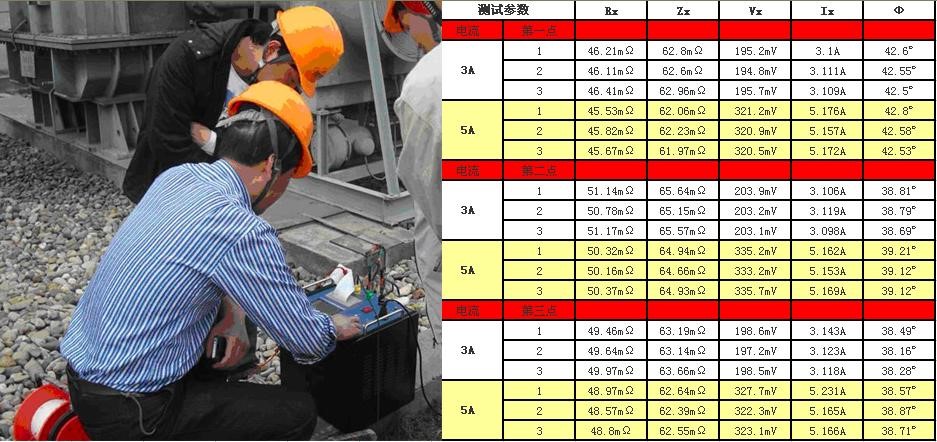 杭州蓝天发电厂工地,采用CT5200大地网接地电阻测试仪测试:接线如图所示,其中电压桩、电流桩入地深度均大于1米。在电压桩上取三个点进行测试,测试过程中分别采用3A和5A电流各测三次,测试采用变频(45Hz/55Hz)方式。