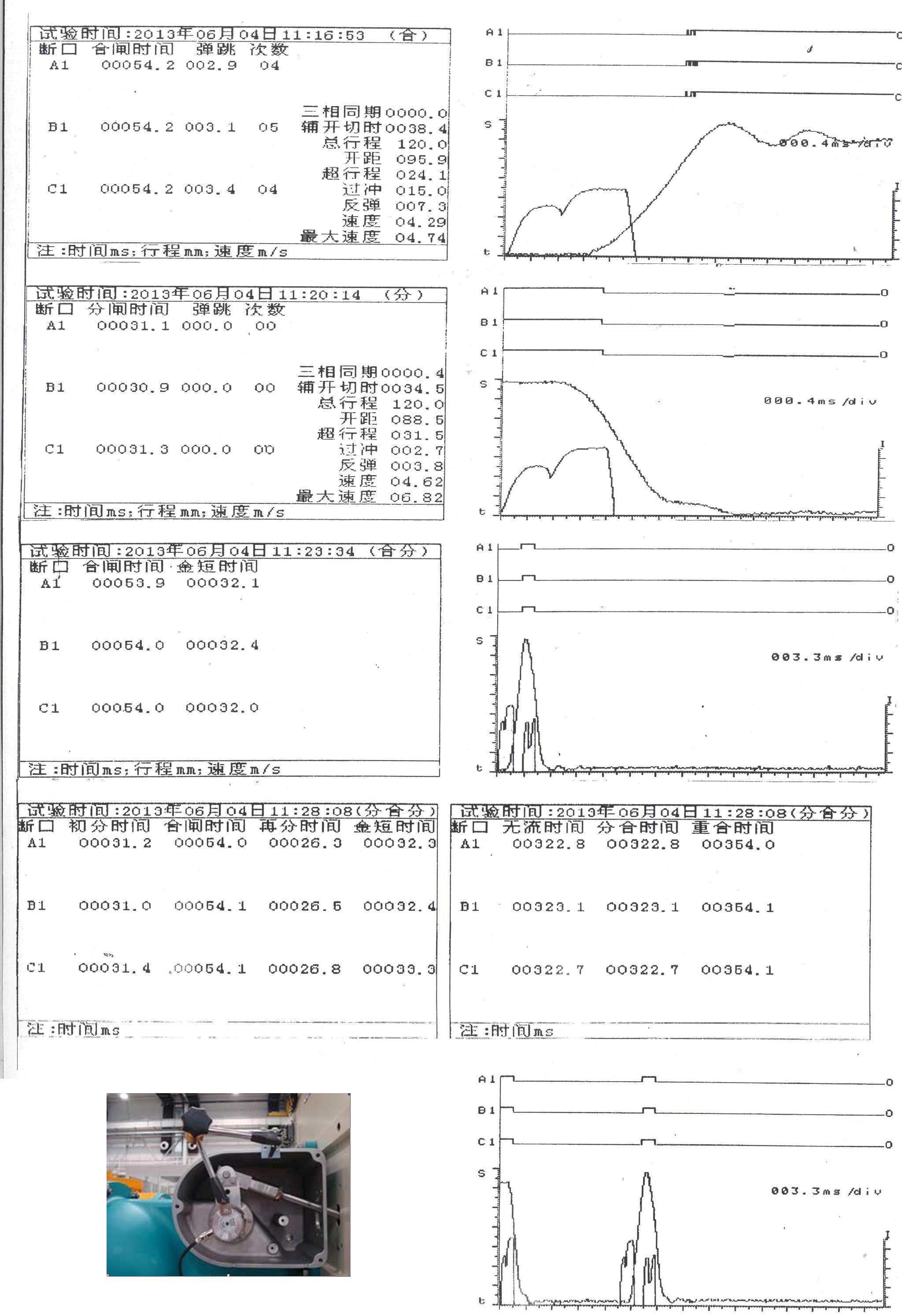2013年06月04日,公司技术人员汇同上海西门子高压开关有限公司技术人员,采用我公司的CT2009高压开关动特性测试仪,进行了8DN8-Ⅱ型全封闭组合电器SF6开关测试。 现场试验了合闸、分闸、合分、分合分等试验。