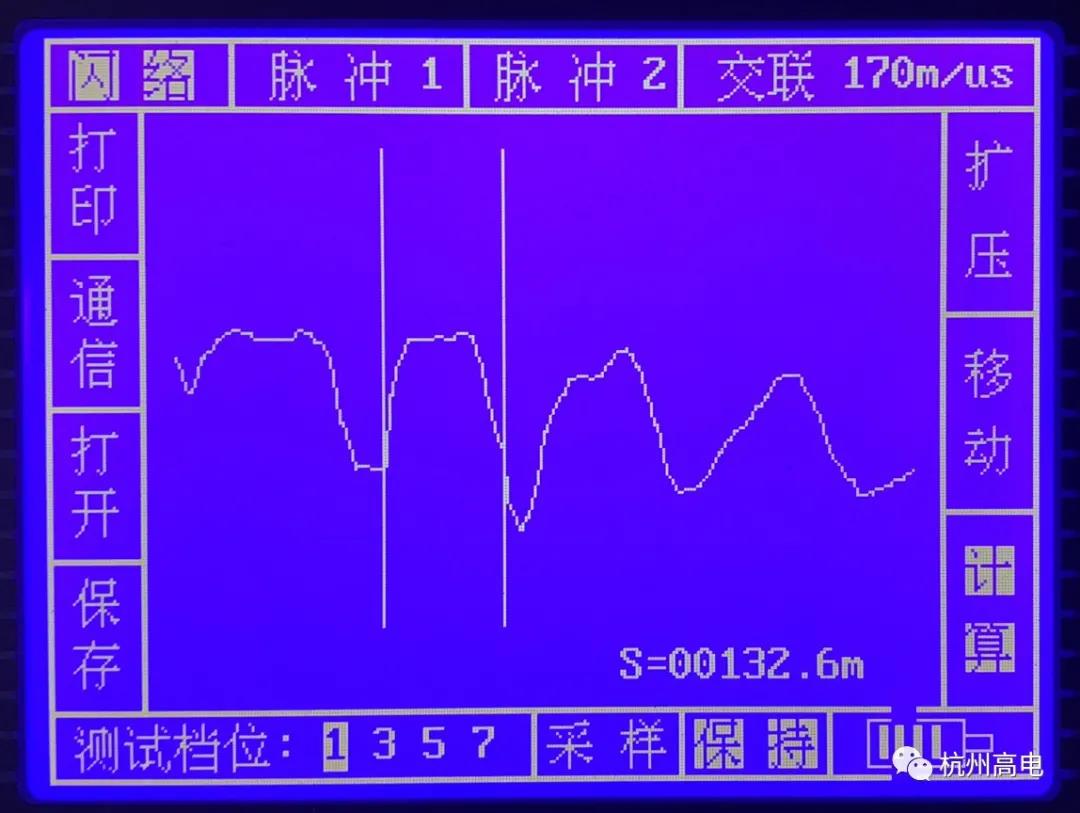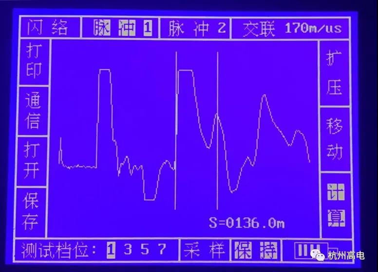 试验描述:缆头两端皆位于丁桥龙湖天街地下车库高压配电房,试验前已先将两头三相分别悬空,铠装、铜屏蔽依旧接地处理。[初步测试]: 分别测得电缆A、B、C三相对主绝缘的绝缘电阻,再用万用表分别测量电缆三相对地,相与相之间的导通情况,便于初步判断电缆故障类型。根据试验结果和现象初步判断,该条电缆A相与C相可能存在绝缘老化或损伤的情况,但故障点和故障现象仍旧不明显,因此需要进一步进行测试判断。[进一步排查]:利用低压脉冲法及路径测试仪先对电缆好相A、B、C相进行全长测试和路径的识别,测得电缆实际全场大约248米,与实际标牌标注米数存在误差,由于现场道路道路修建绿化整改,电缆实际路径与图纸存在差异。低压脉冲法分析:利用低压脉冲法测量故障A相与C相,故障波波形相似,且有明显的故障点波形。可判断A、C相故障点处于136米处,为确保故障点精确定位,通过高压闪络法球间隙直流放电方式进行验证,并通过现场进行高压闪络放电声音监听来确定具体的故障点位置。高压闪络法测试:使用高压闪络法球间隙直流放电方式,针对故障相A进行试验,通过高压闪络法球间隙直流放电方式,试验电压为7kV验证了故障点就在位于电缆路径130米-136米处, 此时,保持对电缆放电状态,试验人员前往130米处进行放电监听,有明显放电声音,可以确定故障点位。