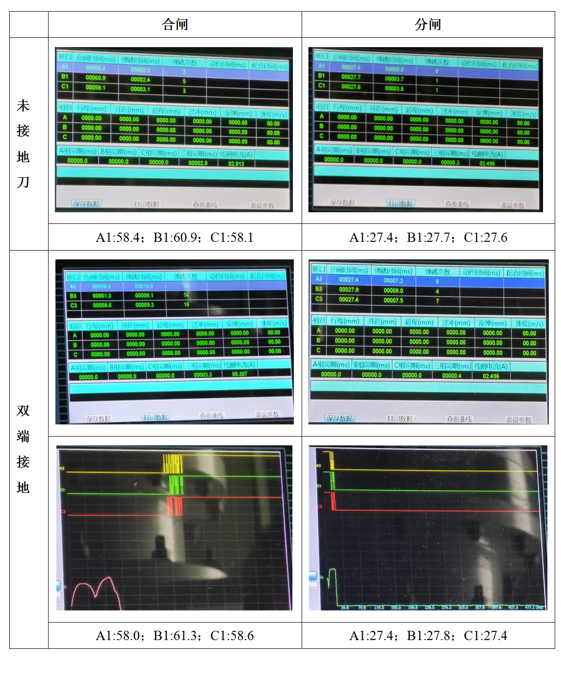 结论:未接地刀与双端接地测试,对应的合、分闸时间相近,误差极小,均有弹跳。