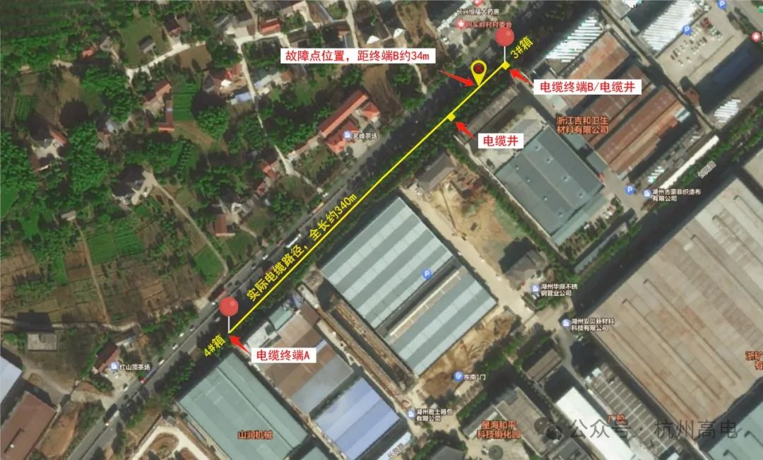 低压脉冲、高压闪络故障点定位:经过初测和高压闪络法定位,从波形上判断出电缆全长约340米,与实际电缆长度接近,故障点距测试位置(4#箱)约306米,距3#箱约34米处。