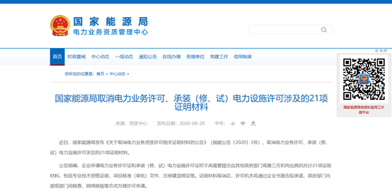 首先来看看,国家能源局(资质中心)对于《关于取消电力业务资质许可相关证明材料的公告》的相关说明:文章来源:国家能源局(资质中心)