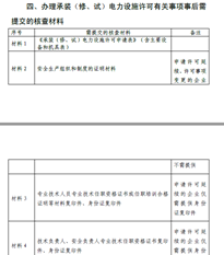 ? 在全面取消所有许可证明材料的基础上,进一步免除填写申请表中的"承装(修、试)电力设施许可申请中的主要设备及机具清单";对于采用前审后批方式进行许可事项申办的企业,但企业必须具备现行规章规范性文件规定的申请条件。