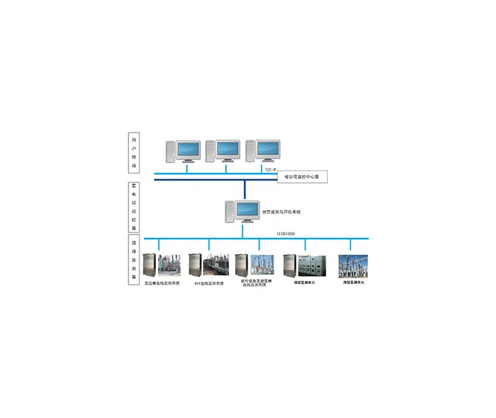 系统主要由“现场监测层(设备端)”、“变电站站控层(变电站控制室)”、“省公司监控中心层(电科院)”、“用户终端”四个层次组成。其中:现场监测层由“主变压器在线监测系统”、“GIS在线监测系统”、“容性设备及避雷器在线监测系统”等系统组成,可以根据用户需求进行配置。系统分别由安装在设备本体上的传感器、信号传输电缆和安装在站内的监测前置单元构成,负责采集、分析和集成传输监测设备的状态参量;变电站站控层由1套在线监测信息采集与传输集成系统和管理软件组成,负责集成、暂存、处理和远程传输五大在线监测系统的数据信息;省公司监控中心层(电科院),主要由监控主机和管理软件构成,负责集成、储存、管理和向用户终端分发、传输相关在线监测数据;用户终端即各级人员的办公电脑,按照权限设置,通过统一的IP地址共享和处置相关的在线监测信息。