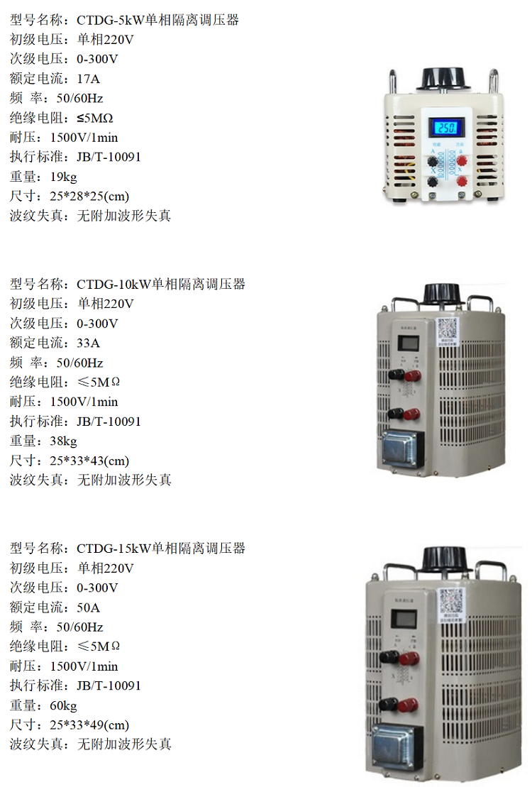 本单相隔离调压器适用于发电机交流阻抗调压调流测试,亦可与CTBC系列无功补偿箱配合使用。